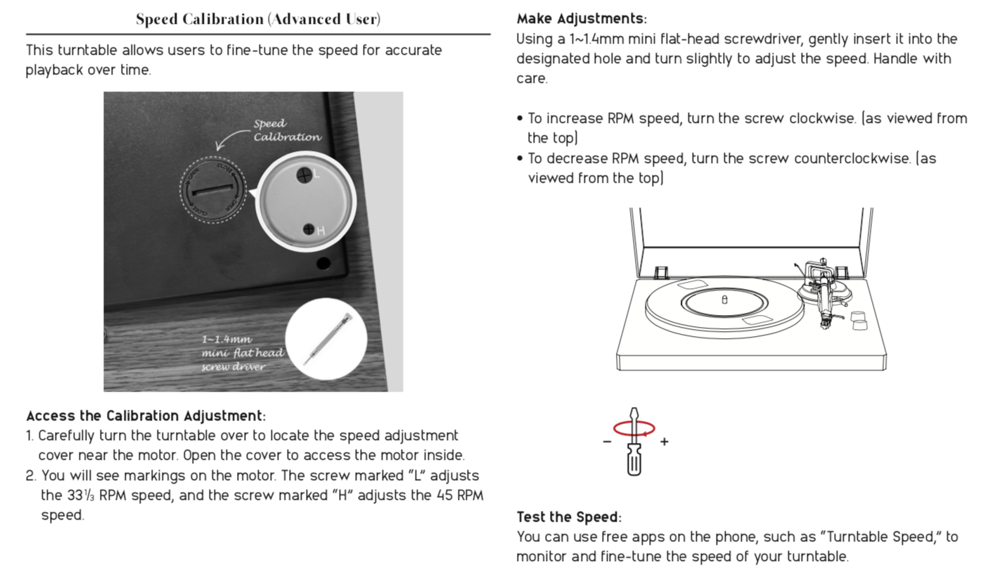 For units manufactured in 2025 and later, this model has been upgraded with a built-in speed calibration function. This feature allows users to fine-tune the turntable speed via an adjustment control located on the underside of the unit.